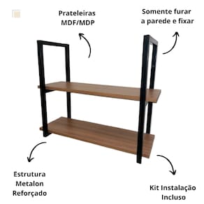 Design industrial elegante que valoriza qualquer ambienteEstrutura em metalon reforçado para máxima durabilidadeAcabamento amadeirado que combina com diversos estilos de decoraçãoDimensões compactas 60×20 cm ideais para cozinhas, salas e escritóriosInstalação fácil com buchas e parafusos inclusosSuporta eletrodomesticos, utensílios, livros, objetos decorativos e muito maisDetalhes do Produto