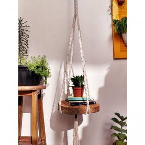 Prateleira suspensa em macramê, com madeira rústica.Modelo: PIPOCAMEDIDAS:Diâmetro da madeira: 30cm.Comprimento do suporte: 2,10m.Por ser natural, formato, cor e espessura da madeira podem variar.A madeira vai tratada e impermeabilizada.