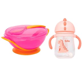 Copo com alça Buba dino rosa 240ml, com canudo em silicone, possui válvula que acompanha o líquido evitando a ingestão de ar.