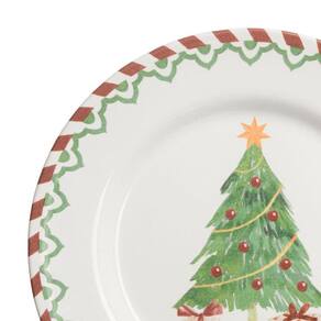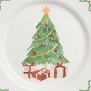 O prato de Sobremesa Natal Tree Gifts possui 21 cm de diâmetro é confeccionado em cerâmica. Se conecta com uma decoração tradicional. Apresenta uma árvore de Natal decorada no centro, adornada com enfeites coloridos e uma estrela no topo, adicionando um toque festivo alegre. A borda possui uma estampa em zigue-zague lembrando bengalas doces que complementa o design natalino.