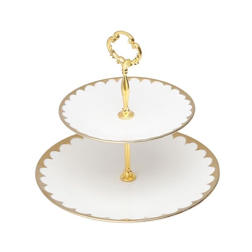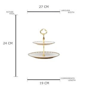 Características do produto Material:porcelana Dimensões totais axlxp : 27 x 27 x 24 cm Diâmetro do prato maior: 27 cm Diâmetro do prato menor: 19 cm Linha: egg Cor: branco e dourado Marca: wolff