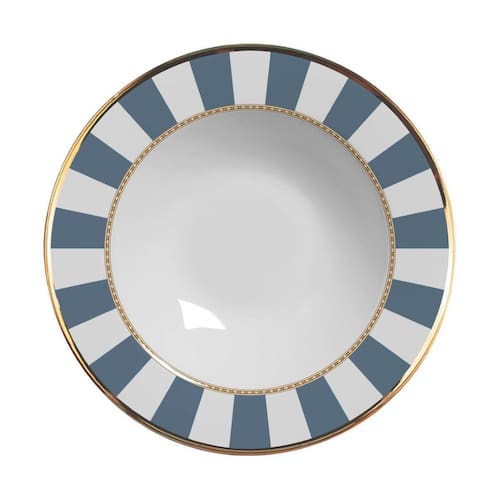 A caixa de pratos Fundos da coleção Blue Strip, desenvolvido em cerâmica Faiança Feldspática, diferenciada por sua variedade de cores que entram em harmonia com as estampas, enobrecendo a sua mesa e deixando o seu jantar mais elegante, convidativo e saudável, pois não libera substâncias tóxicas.