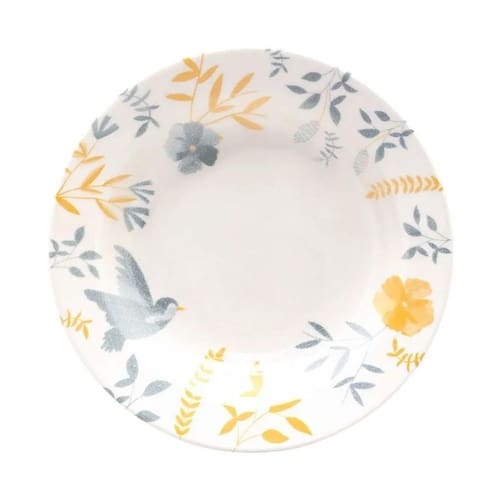 Prato Fundo de Cerâmica Donna Bem-Te-Vi 21,5cm 01un - Biona 5409 Leve a beleza da fauna e flora brasileira para a sua mesa com o Prato Fundo Donna Bem-te-vi A coleção Donna Bem-te-vi celebra a riqueza natural do Brasil com uma decoração que une ramos, flores e o encantador passarinho Bem-te-vi. Em tons suaves de amarelo e azul claro, cada peça traz um toque da fauna e flora brasileira. O prato fundo, vendido individualmente, é uma peça que combina tradição e beleza. Garanta já o seu e leve a natureza brasileira para sua mesa