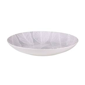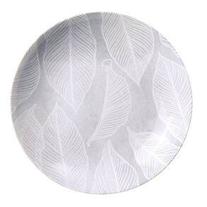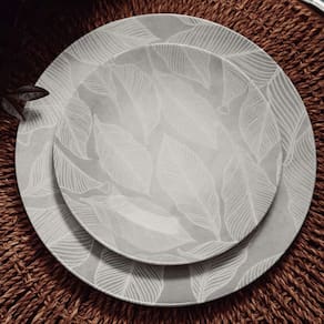 Com 21 cm de diâmetro, ele possui uma estampa delicada de folhas brancas sobre um fundo que remete à textura da pedra neutra, elegante e versátil para todas as estações. Ideal tanto para o dia a dia quanto para ocasiões especiais.