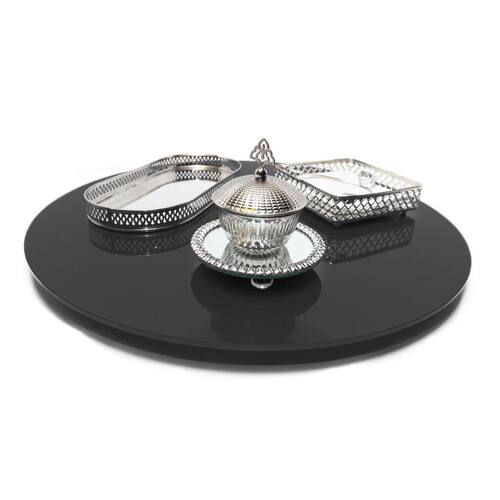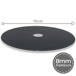 Prato Giratório 75Cm De Vidro Temperado 8Mm Cor Preto - vidro temperado 8mm 5 à 7x mais resistente do que o vidro comum; - muito mais resistente à variações de temperatura de até 250ºc panelas etc... - base giratório reforçada e blindada oferece giro livre e macio sem trancos; - prato inferior garante a maior estabilidade 'não tomba'; - qualidade high-premium "foi feito para durar"; - suporta em sua base até 100kg; - corte à laser "sem rebarbas", acabamento perfeito c/borda infinita; - vidro temperado é considerado como "vidro de segurança" não estilhaça ; - sucesso absoluto, quem utiliza aprova e recomenda Atenção Nosso maior compromisso é a qualidade e segurança, fique atento à economizar comprando prato giratório pelo menor preço. Com segurança não se brinca, existem pratos no mercado que estão descolando à mesa, isso pode transformar um momento familiar no maior pesadelo. Muitas vezes o barato sai caro. Exija qualidade para sua total segurança. Dica: decorativo e funcional, pode ser utilizado também como centro de mesa. Dica extra: pode ser utilizado para exposição de produtos em lojas, é ótimo para confeitar bolos. Cuidados: Utilize detergente neutro e enxágue com água em abundância. Para secar utilize pano seco e macio. Utilize esponja macia e não abrasiva. Características: Altura: 2cm Diâmetro: 75cm Espessura do vidro: 8mm Cor: preto Material: vidro e rolamento de alumínio Conteúdo: 1 x prato giratório preto 75cm Marca: Não Informado