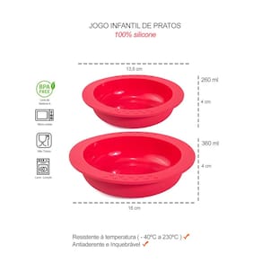 Jogo de prato infantil em silicone. O prato infantil é perfeito para as crianças iniciarem a comer de forma independente. O prato pode ir à máquina de lava-louças, micro-ondas, geladeira e freezer. Suporta altas e baixas temperaturas (-40 ºC até 230ºC). O prato de silicone não mancha, não enferruja, não amassa e não absorve cheiro. Alem de ser antiaderente, flexivel e inquebravel. O Prato Infantil de Silicone foi produzido livre de BPA, item essencial para as crianças a partir de três anos e uma ótima opção, pois auxilia a coordenação motora, sendo leve e facil de segurar.