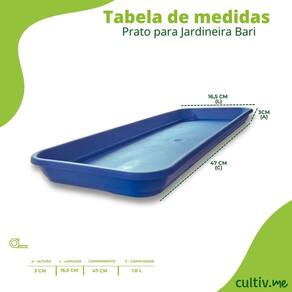 Descrição* Complete a funcionalidade da sua Jardineira Bari 50 com o Prato Bari.* Perfeito para proteger o seu espaço contra o acúmulo de água e ainda realçar o charme das suas plantas.* Feito com materiais de alta resistência, unindo tecnologia e sustentabilidade.