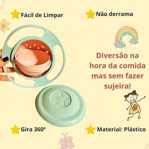 O prato mágico giratório possui design exclusivo. Não importa a posição que a criança segure, a parte interna continua sempre virada para cima, sem deixar o alimento cair. Ele ainda é resistente à queda, vem com tampa, com partes laváveis, pode ser levado à lava-louças e não é recomendado o uso no micro-ondas.