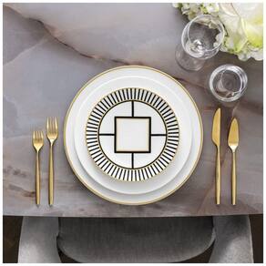 Este prato de sobremesa para café da manhã é altamente versátil e apresenta um padrão brilhante, resultado da tecnologia Inglaze Gold, que garante durabilidade e beleza ao longo do tempo. Feito de porcelana Premium Bone, o prato é prático, podendo ser lavado na máquina de lavar louça e utilizado no micro-ondas.