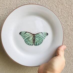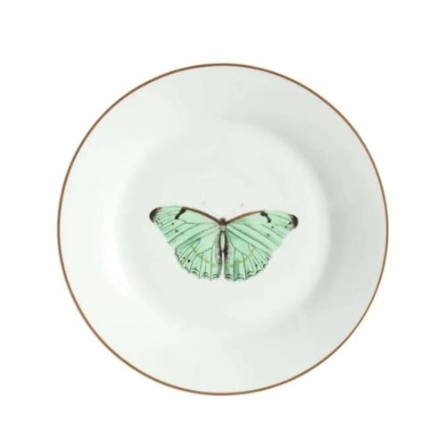 Com um delicado desenho de borboleta, este prato de porcelana traz um toque de elegância e sofisticação às suas refeições.