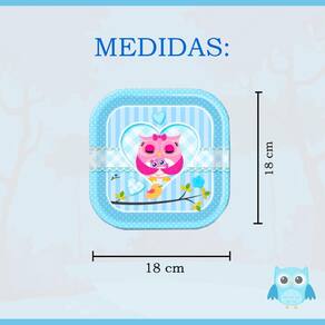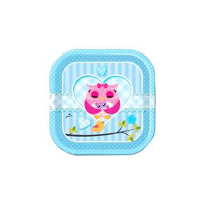 Prato Quadrado Chá De Bebê Mamãe Coruja Azul 18Cm Com 8Un
