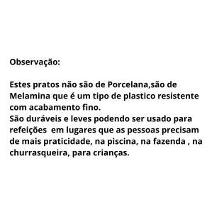 Obsevação: Estes Pratos não são de Porcelana,São de Melamina que é um Tipo de Plastico Resistente com acabamento Fino.São duráveis e leves podendo ser utilizado para refeições e em lugares que as pessoas precisam de mais praticidade, na piscina, na fazenda , na churrasqueira, para crianças.