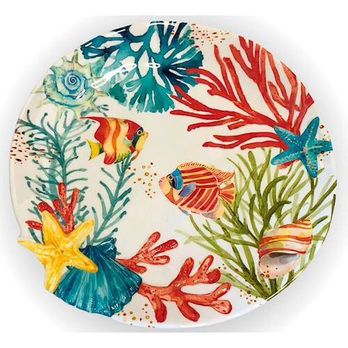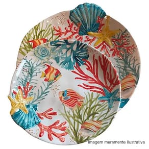 Prato de sobremesa melamina com estrela e concha em relevo, estampado com desenho fundo do mar, com corais, conchas e peixes.