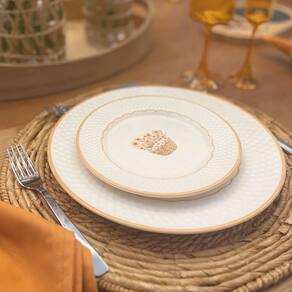 O Prato Sousplat Huppert Páscoa, da Alleanza é a escolha perfeita para quem busca sofisticação e funcionalidade. Com um diâmetro de 34 cm, ele se destaca em qualquer mesa de jantar, proporcionando um toque de elegância. Fabricado com a cerâmica feldspática de alta resistência da Alleanza, este prato garante durabilidade superior e robustez para o uso frequente, resistindo a lascas e arranhões. O esmalte de alta qualidade é liso, brilhante e facilita a limpeza. Além de sua beleza e resistência, o conjunto é prático e funcional: é seguro para uso em micro-ondas e totalmente apto para a máquina de lavar louças, o que o torna um investimento duradouro. Ideal para servir a família e os amigos de forma muito elegante! Informações básicas: Marca: Alleanza Referência: 7599-319 Características: Composição: Cerâmica Feldspática Medidas aprox. dos pratos (A x D): 2,1 x 34 cm Conteúdo da embalagem: 1 Prato Sousplat Especificações técnicas: Garantia: contra defeitos de fabricação