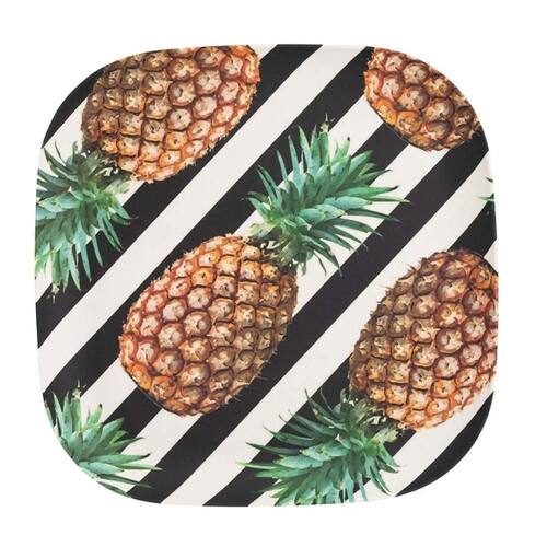 Prato Summer Abacaxi 20x20cm - Oxford Aproveitando as vantagens da fibra de bambu, que são a leveza e a segurança, a oxford dispõe de uma linha ideal para uso em áreas ao ar livre, como piscinas e jardins. São peças perfeitas para confraternizações com a família e amigos nestes locais. A figura do abacaxi é atual e vem tomando conta das estampas há algum tempo. Nessa opção, uma padronagem de listas pretas e brancas como fundo deixa as peças ainda mais contemporâneas. Esses itens são ideais apenas para servir alimentos, não podendo ser utilizados para cortá-los. Os produtos feitos com fibra de bambu não podem ser aquecidos ou levados ao forno micro-ondas. No entanto, podem ser colocados na lava-louças porque a temperatura da água é menor do que a temperatura atingida no micro-ondas.