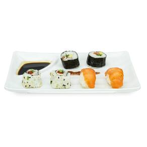 Esse Prato é ideal para servir Sushi, Sashimi, e até outros pratos da culinária Oriental, é muito prático e charmoso: é retangular e vem com um espaço para colocar o molho shoyu. Garanta uma mesa linda e com a linha Melamina 100% Gourmet Mix! Especificações: Ref.: GX5404 Material: Melamina 100% Medidas do Produto - dimensões aproximadas: Peso Kg 0,410 CxLxA : 25 x 16 x 3,3 cm Marca: Gourmet Mix Fabricante: Marcamix - Utilidades Gourmet Principais características da Melamina 100% Gourmet Mix: - Cor e brilho característicos de porcelana - Não mancha - Não pega cheiro - Pode ir à máquina de lavar louças - Alta resistência e durabilidade - Fácil armazenamento por serem empilháveis e terem menos peso que porcelana - Possui selo internacional: próprio para alimentos - Não vai ao forno convencional ou microondas Uso seguro/adequado: Para conservar a peça sempre brilhante, utilize um detergente neutro na lavagem. Pode ser lavada em máquina de lavar louças, em casa ou industriais. E para melhores resultados use sempre uma solução alcalina. Lave de preferência em água morna, e use sempre uma esponja macia. Não use o lado verde da esponja ou bucha de metal. Não leve ao forno convencional e nem ao forno de microondas, pois danificará o produto.