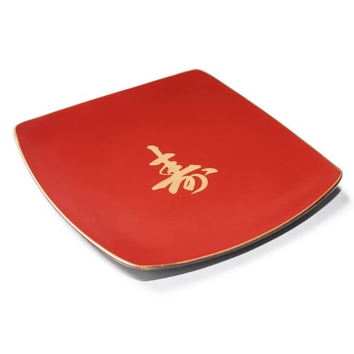 Prato com acabamento vermelho quadrado de excelente qualidade, alto brilho e pintura do ideograma em dourado que representa felicidade. Peça indispensável para amantes da culinária oriental, com cores fortes inspiradoras nas tradicionais decorações japonesas. Perfeita para apreciar a culinária japonesa entre amigos e familiares de forma tradicional. Ideal para servir sushis, sashimis, niguiris e temakis de forma tradicional no uso doméstico ou nos restaurantes. - Facilita e dar mais estilo às suas refeições orientais. Cuidados: - Lavar com água morna e sabão neutro utilizando esponja macia, seguido de pano seco. - Não utilizar produtos químicos ou abrasivos na limpeza. - Não vai a lava-louças.