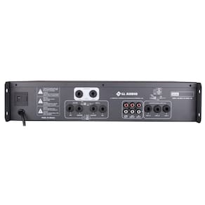 Saídas: 1 saída auxiliar line out com 2 conectores rca mono 1 saídas output com 2 conectores p10 e volume master 2 caixas de 8 ohms 140 w rms 1 caixa de 4 ohms 250 w rms