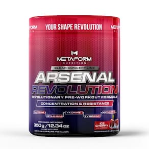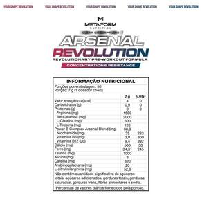 O Pré-treino Arsenal Revolution da Metaform Nutrition é uma fórmula desenvolvida para apoiar o desempenho físico durante os treinos. Cada porção de 7g contém ingredientes como Beta-Alanina, L-Arginina e Cafeína, que podem contribuir para aumentar a energia, o foco e a resistência.
