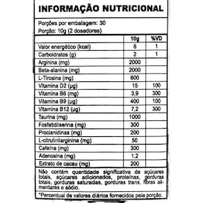 Fórmula pré-treino avançada para aumentar energia e foco Mistura exclusiva para melhorar o desempenho durante o treino Aumenta a resistência e a força muscular Contém ingredientes selecionados para maximizar a vascularização e a bomba muscular Sem adição de açúcar e baixo teor de calorias Sabor amarelo refrescante e delicioso Embalagem conveniente de 300g, fácil de transportar e usar