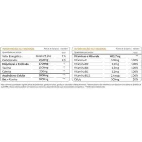 Ingredientes maçã verde: beta-alanina, taurina, maltodextrina, cafeína, acidulante: ácido cítrico, aroma artificial idêntico ao natural de maçã verde, edulcorante: sucralose, antiumectante: fosfato tricálcico, corantes amarelo crepúsculo, amarelo tartazina e azul brilhante, ácido ascórbico vit. C , riboflavina vit. B2 , piridoxina vit. B6 , tiamina vit. B1 , cianocobalamina vit. B12 . Não contém glúten.