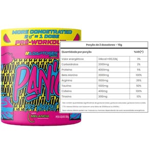 Panic Pré Treino chega com sua fórmula explosiva desenvolvida pela Adaptogen, possui dosagem altíssima de Beta-Alanina, Taurina e Cafeína. Esses elementos são estimulantes que garantem que você tenha a disposição e energia necessárias para realizar um treinamento físico intenso.