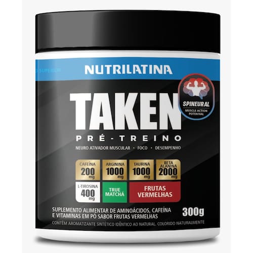 O Pré-Treino Taken Frutas Vermelhas é a solução da Nutrilatina para quem busca energia, foco e performance desde a primeira dose. Sua fórmula exclusiva com Spineural® ativa corpo e mente para treinos mais intensos, reduzindo o cansaço físico e acelerando a resposta muscular. Principais Benefícios Mais energia e disposição desde o início Redução da fadiga física Melhora no foco e coordenação motora Otimização do “pump” muscular