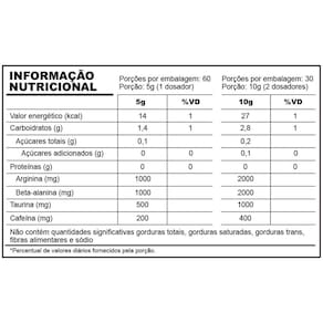 Ingredientes: Cloridrato De L-Arginina, Beta-Alanina, Maltodextrina, Taurina, Beterraba Em Pó, Melancia Em Pó, Cafeína, Extrato De Laranja Amarga, Acidulante Ácido Cítrico, Antiumectante Dióxido De Silício E Fosfato Tricálcico, Aromatizante Idêntico Ao Natural, Edulcorante Sucralose E Acessulfame De Potássio, Corante.