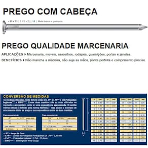 Prego com cabeça 25x72 - [6.1/2x2] - mata burros e garimpos Descrição: ????O Prego com cabeça possui corpo liso, cabeça cônica e axadrezada e ponta tipo diamante. Aplicações: Construção de todos os tipos; Confecção de estruturas temporárias; Construções Pesadas; Marcenaria; Embalagens; Caixarias; Pontes; Mata-burros e Porteiras. Benefícios: Maior rendimento por quilo e Maior giro no Ponto-de-Venda. Dimensão (JP x LPP): 25 x 72. Dimensão (pol. x BWG): 6.1/2 x 2. Quantidade aproximada em 1kg: 19. Conteúdo: Caixa com 20 pacotes de 1 kg cada.