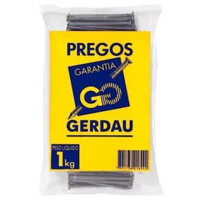 Prego com cabeça 27x30 Descrição: ????O Prego com cabeça possui corpo liso, cabeça cônica e axadrezada e ponta tipo diamante. Aplicações: Construção de todos os tipos; Confecção de estruturas temporárias; Construções Pesadas; Marcenaria; Embalagens; Caixarias; Pontes; Mata-burros e Porteiras. Benefícios: Maior rendimento por quilo e Maior giro no Ponto-de-Venda. Dimensão (JP x LPP): 27 x 30. Conteúdo: Caixa com 20 pacotes de 1 kg cada.