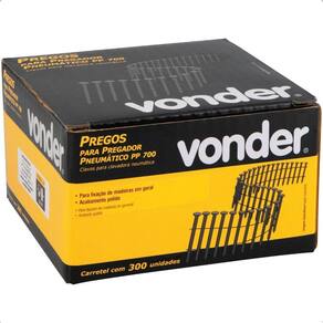 O Prego Anelado Vonder 70 mm PP700 Polido com 300 Peças é o parceiro ideal para quem busca eficiência em fixações profissionais de madeira. Desenvolvido especialmente para uso com o Pregador Pneumático PP 700 Vonder, esse prego garante alto desempenho em trabalhos intensos, com velocidade e segurança, seja em carpintarias, marcenarias, obras civis ou instalações industriais.