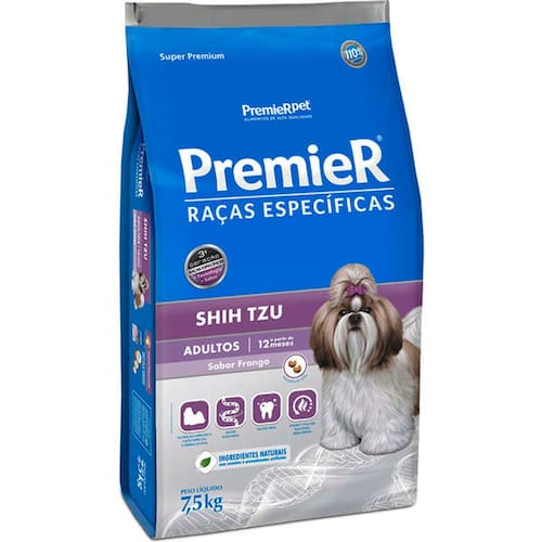 Ração Premier Raças Shih Tzu Adultos 7,5kg- Odor e volume das fezes reduzidos; - Saúde intestinal: através da combinação de ingredientes de alta digestibilidade, fibras especiais e prebióticos; - Saúde oral: contém hexametafosfato de sódio, importante ingrediente para a prevenção da formação do cálculo dental; - Nutrição específica: formato especial do grão que facilita a preensão por cães braquicefálicos, Pelagem bonita e pele saudável através de ácidos graxos essenciais ômegas 3 e 6, biotina e zinco.