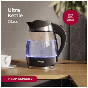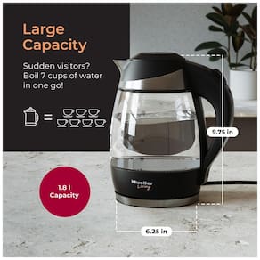 Chaleira Elétrica Premium 1.8L 1500W com desligamento automático, feita com vidro borosilicato, aço inoxidável 304 e copoliéster resistente ao calor. Possui controlador de termostato de alta qualidade e alça antiderrapante resistente ao calor.Características