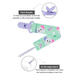 Características Técnicas: Idade recomendada: a partir de 3 meses Cor predominante: verde e roxo Estampa: elefante Composição: alça 100% poliéster, prendedor 100% polipropileno PP e cordão 100% poliamida Clipe com trava
