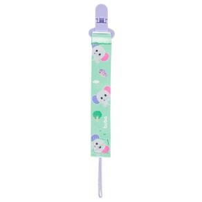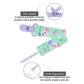 Características Técnicas: Idade recomendada: a partir de 3 meses Cor predominante: verde e roxo Estampa: elefante Composição: alça 100% poliéster, prendedor 100% polipropileno PP e cordão 100% poliamida Clipe com trava