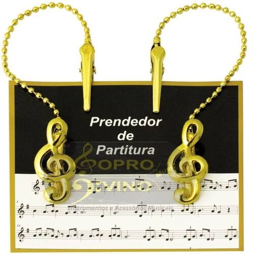 Produto fabricado em metal de excelente qualidade, com acabamento na cor Dourado, tamanho médio, no qual possui um sistema simples e prático para prender folhas, partituras, livros ou hinários. Além de possuir o sistema de prender a folha na clave de sol, também possui o clipet na corrente, no qual pode ser fixado na capa do livro / hinário ou também auxiliando a prender cada lado da folha com 02 clipets. Fácil uso, colocar e retirar, evitando deixar fixo no produto no qual será utilizado, evitando quebras ou outros tipos de danos. Características: