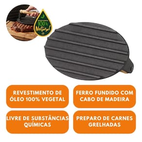 Fabricado em ferro de alta qualidade, o utensílio proporciona melhor resultado no preparo dos alimentos, contribuindo para sabor, suculência e um visual mais apetitoso. O cabo de madeira garante maior estabilidade e segurança durante o manuseio.