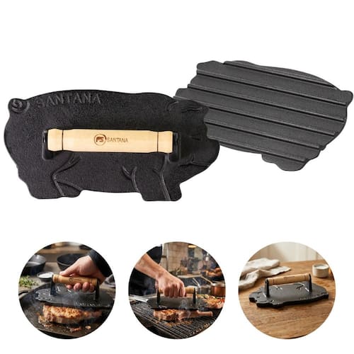 O Prensador de Bife Porquinho da Santana é um utensílio prático e eficiente para melhorar o preparo de alimentos grelhados. Ideal para pressionar carnes, pães e outros alimentos durante o preparo, ajuda a proporcionar um melhor resultado em sabor, suculência e aparência dos alimentos.