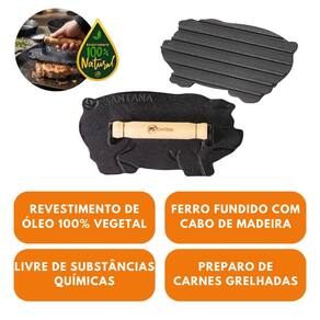 Fabricado em ferro fundido, oferece boa distribuição de peso para pressionar os alimentos de forma uniforme. Seu design em formato de porquinho torna o utensílio diferenciado e também decorativo para a cozinha. Ideal para prensar carnes, pães e outros alimentos durante o preparo em chapas e grelhas.