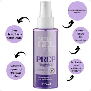 Com o Prep Higienizador Impala Gel Plus 115ml, você não apenas prepara suas unhas para a aplicação de esmaltes, mas também cuida da saúde delas, garantindo que estejam sempre limpas e prontas para brilhar. Experimente e sinta a diferença na sua manicure!