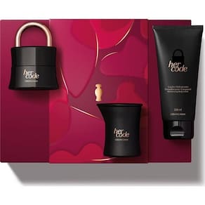 Presente feminino kit perfume her code o boticário Este kit contém: 01 her code eau de parfum 50ml 01 loção hidratante corporal her code 200ml 01 vela de massagem óleo corporal her code 90g O kit presente dia dos namorados her code vem com dois itens de perfumação e hidratação, além de uma vela de massagem em óleo corporal dessa enigmática linha. Os três itens vêm guardados em uma caixa de presente especial. Um presente dia dos namorados para namorada mais que especial: Eau de parfum Her code eau de parfum traz o acorde olfativo código secreto: único e instigante, uma combinação de ingredientes que despertam mistério. Um efeito licoroso e inebriante combinado à indulgência das frutas vermelhas, com a sofisticação do jasmim, envelopado com notas de sândalo. O frasco, em formato de cadeado, liberta o seu desejo e toda a sua sensualidade, com o ar do mistério e os códigos de sofisticação da linha. Vela de massagem óleo corporal A vela de massagem óleo corporal her code combina uma textura envolvente com a fragrância instigante e Sensual de her code, para estimular novas sensações. Benefícios: Hidratação imediata Textura delicada e confortável Sensação de relaxamento após massagem Sensação de pele macia e aveludada Pele perfumada Loção corporal Com o mesmo olfativo do eau de parfum, a loção hidratante corporal her code oferece mais que hidratação: a liberdade de se sentir bem na própria pele. Com o acorde olfativo código secreto, traz uma combinação de ingredientes únicos e instigantes que despertam mistério. Caixa para presente A caixa de presente vermelha demonstra todo o carinho que quem é apaixonado tem pra dar, destacando a simbologia do amor: corações vermelhos em diferentes formatos, demonstrando as várias formas de amar. Dimensões: 28x21x7 cm Marca: Não Informado Ean: 7891033852932