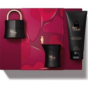 Presente feminino kit perfume her code o boticário Este kit contém: 01 her code eau de parfum 50ml 01 loção hidratante corporal her code 200ml 01 vela de massagem óleo corporal her code 90g O kit presente dia dos namorados her code vem com dois itens de perfumação e hidratação, além de uma vela de massagem em óleo corporal dessa enigmática linha. Os três itens vêm guardados em uma caixa de presente especial. Um presente dia dos namorados para namorada mais que especial: Eau de parfum Her code eau de parfum traz o acorde olfativo código secreto: único e instigante, uma combinação de ingredientes que despertam mistério. Um efeito licoroso e inebriante combinado à indulgência das frutas vermelhas, com a sofisticação do jasmim, envelopado com notas de sândalo. O frasco, em formato de cadeado, liberta o seu desejo e toda a sua sensualidade, com o ar do mistério e os códigos de sofisticação da linha. Vela de massagem óleo corporal A vela de massagem óleo corporal her code combina uma textura envolvente com a fragrância instigante e Sensual de her code, para estimular novas sensações. Benefícios: Hidratação imediata Textura delicada e confortável Sensação de relaxamento após massagem Sensação de pele macia e aveludada Pele perfumada Loção corporal Com o mesmo olfativo do eau de parfum, a loção hidratante corporal her code oferece mais que hidratação: a liberdade de se sentir bem na própria pele. Com o acorde olfativo código secreto, traz uma combinação de ingredientes únicos e instigantes que despertam mistério. Caixa para presente A caixa de presente vermelha demonstra todo o carinho que quem é apaixonado tem pra dar, destacando a simbologia do amor: corações vermelhos em diferentes formatos, demonstrando as várias formas de amar. Dimensões: 28x21x7 cm Marca: Não Informado
