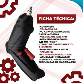 Especificações Voltagem: 3,6 v a 4,8 v dc Velocidade: até 250 rpm Torque máximo: 3,5 nm Rotação: bidirecional Bateria: 1500 mah recarregável Tempo de carga: 2 horas Autonomia aproximada: 1 hora Material: abs e borracha Tamanho da parafusadeira: 12 cm x 11,5 cm Tamanho da maleta: 24 cm x 18,5 cm x 6 cm Peso total: 876 g Marca: Não Informado