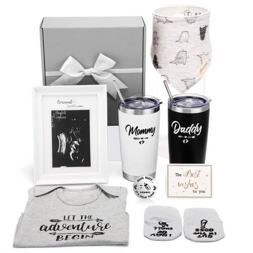 - Presente de boas-vindas para bebês: a cesta de presentes para bebês inclui um conjunto de copos de vinho para mamãe e papai (inclui 2 pincéis e 2 canudos), uma moeda de tomada de decisão, um macacão unissex (0 a 3 meses), um par de meias criativas para bebês, 1 babador, um cartão de felicitações para bebê, uma moldura de ultrassom, um laço e uma caixa de presente de papelão; envie este bebê revelar presentes para os pais para um pequeno especial para recebê-los no mundo