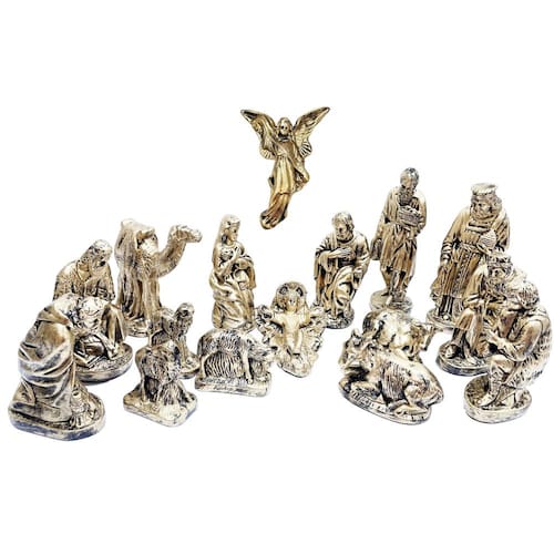 Especificações Técnicas: - Material: Gesso maciço - Pintura: Envelhecida - Quantidade de peças: 15 - Tamanhos: Variam de 10 a 20 cm