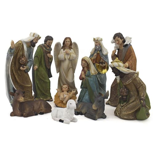 Presépio Importado Resina 11 peças 30 cm Presépio, do latim Praesaepe, significa estrebaria ou curral. É um gesto que ajuda a preparar a celebração do nascimento de Jesus. Geralmente é formado pelo menino Jesus, Maria, José, os Reis Magos, o anjo, os pastores e os animais. Dimensões: Menino Jesus: Altura: 6 cm - Largura: 12 cm - Profundidade: 8 cm Maria: altura: 21 cm - Largura: 10 cm - Profundidade: 11 cm José: altura: 30 cm - Largura: 15 cm - Profundidade: 12 cm Anjo: altura: 30 cm - Largura: 13 cm - Profundidade: 10 cm Baltazar: altura: 20 cm - Largura: 14 cm - Profundidade: 14 cm Gaspar: altura: 30 cm - Largura: 11 cm - Profundidade: 11 cm Melchior: altura: 30 cm - Largura: 15 cm - Profundidade: 13 cm Pastor: altura: 30 cm - Largura: 10 cm - Profundidade: 11 cm Burro: altura: 10 cm - Largura: 13 cm - Profundidade: 7 cm Vaca: altura: 11 cm - Largura: 15 cm - Profundidade: 7 cm Ovelha: Altura: 8 cm - Largura: 10 cm - Profundidade: 5 cm Manjedoura: altura: 6 cm - Largura: 12 cm - Profundidade: 10 cm Dimensões aproximadas do produto. Produto fabricado a mão, podendo sofrer variações de cores. Marca: Amém Decoração Religiosa Marca: Amém Decoração Religiosa