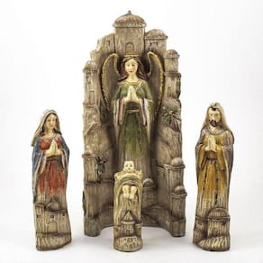 Presépio Importado Resina 4 Peças 24 cm Presépio, do latim Praesaepe, significa estrebaria ou curral. É um gesto que ajuda a preparar a celebração do nascimento de Jesus. Geralmente é formado pelo menino Jesus, Maria, José, os Reis Magos, o anjo, os pastores e os animais. Dimensões: Menino Jesus: Altura: 9 cm - Largura: 3 cm - Profundidade: 3 cm Maria: altura: 14 cm - Largura: 4 cm - Profundidade: 4 cm José: altura: 14 cm - Largura: 4 cm - Profundidade: 4 cm Anjo: altura: 24 cm - Largura: 10 cm - Profundidade: 5 cm Dimensões aproximadas do produto. Produto fabricado a mão, podendo sofrer variações de cores. Marca: Amém Decoração Religiosa Ean: 7890499232746