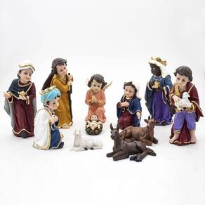 Presépio Infantil Resina 11 Peças 13 cm Presépio, do latim Praesaepe, significa estrebaria ou curral. É um gesto que ajuda a preparar a celebração do nascimento de Jesus. Geralmente é formado pelo menino Jesus, Maria, José, os Reis Magos, o anjo, os pastores e os animais.Dimensões:Menino Jesus: Altura: 3 cm - Largura: 4,5 cm - Profundidade: 3 cmMaria: altura: 9 cm - Largura: 6 cm - Profundidade: 4 cmJosé: altura: 13 cm - Largura: 6 cm - Profundidade: 6 cmAnjo: altura: 10 cm - Largura: 6 cm - Profundidade: 6 cmBaltazar: altura: 13 cm - Largura: 6 cm - Profundidade: 5,5 cmGaspar: altura: 13 cm - Largura: 6 cm - Profundidade: 5 cmMelchior: altura: 10 cm - Largura: 5 cm - Profundidade: 5 cmPastor: altura: 13 cm - Largura: 6 cm - Profundidade: 5 cmBurro: altura: 6 cm - Largura: 7 cm - Profundidade: 4 cmVaca: altura: 5 cm - Largura: 6,5 cm - Profundidade: 4 cmOvelha: altura: 4 cm - Largura: 5 cm - Profundidade: 3 cmDimensões aproximadas do produto.Produto fabricado a mão, podendo sofrer variações de cores. Marca: Amém Decoração Religiosa