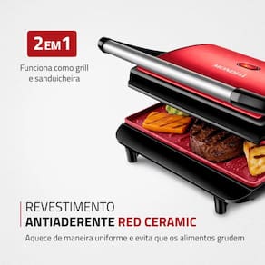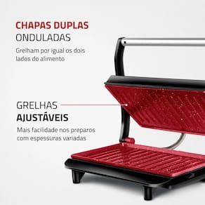 Press Grill e Sanduicheira Mondial PG-01-RC com 1000W, revestimento antiaderente Red Ceramic, grelhas duplas onduladas ajustáveis, alça com toque frio e base antiderrapante.Funciona como grill