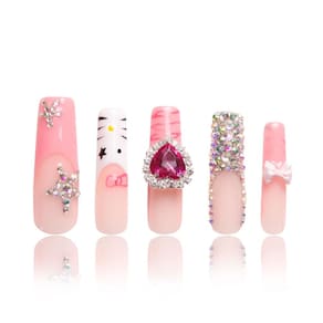 LOVFUL Gatinho de balanço Press on Nails | Feito à mão com cristais totalmente cobertos | Unhas postiças reutilizáveis | Quadrado comprimento médio 4,3 cm | H257-S